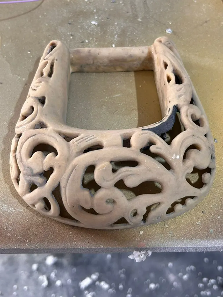 Para la fabricación del ficticio de la bota Dolly, primero tallamos sobre porexpan. Una vez tallada y pulida las formas, se procedió a la realización del patronaje para forrar la figura y darle ese aspecto rompedor que tiene la pieza original. Una vez recubierta la pieza del material que simula la piel de la bota original, terminamos el trabajo con el tachonado y la hebilla. Estos adornos se han reproducido a mano, uno a uno y se han texturizado y pintado por nuestro equipo.