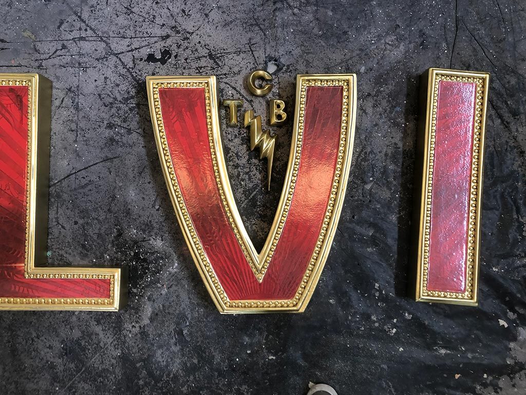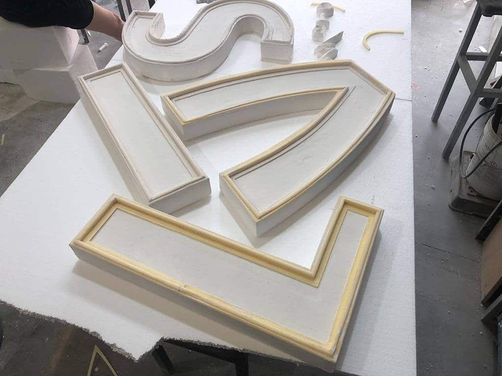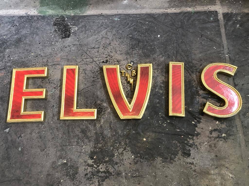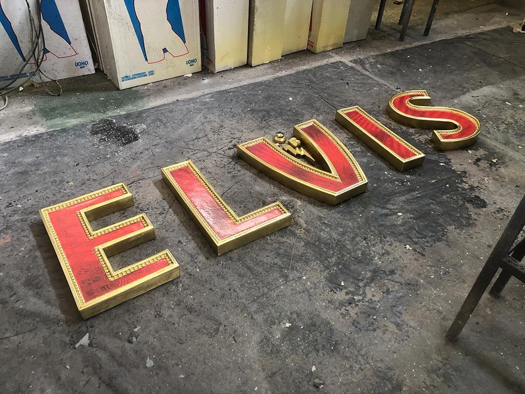 Estas Letras corpóreas para photocall de Elvis se han fabricado en porexpan endurecido con poliurea. Una vez terminada la talla de las letras, se ha procedido a su decoración con elementos metálicos y se ha realizado la pintura de las mismas. Por último, se han instalado en el photocall. Este trabajo es un encargo de Comunicación Fotograma 25.