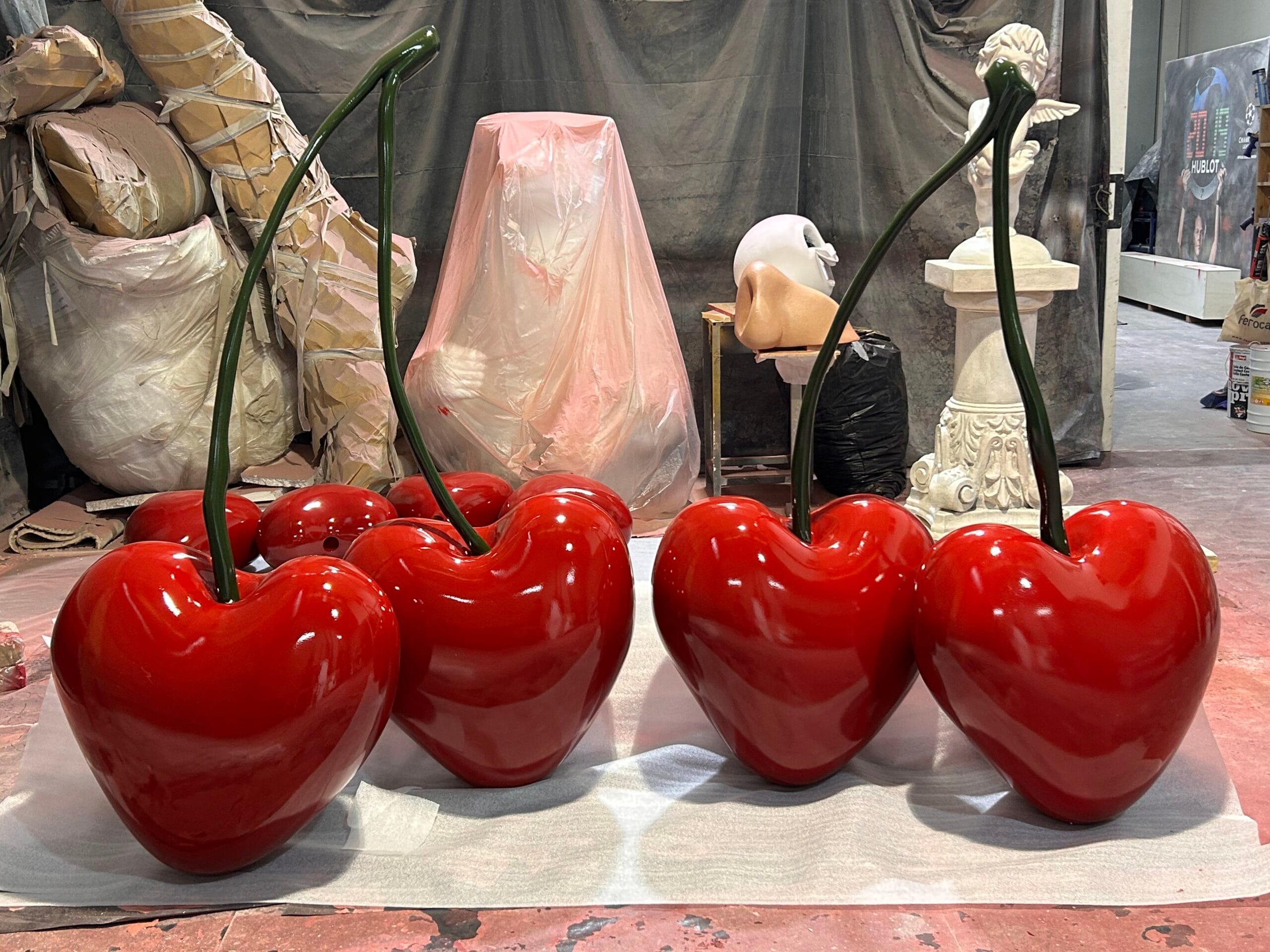 Para la decoración de la primera planta de tres, se han fabricado en poliestireno expandido endurecido con poliurea, una escultura de cerezas con forma de corazón. Para resaltar aún más el acabado de la pieza, se ha utilizado un barniz de alto brillo que da un aspecto espectacular a la escultura en porexpan. Esta escultura está actualmente en el escaparate de la primera planta de la tienda que ha inaugurado recientemente la marca Nude Project en Amsterdam.